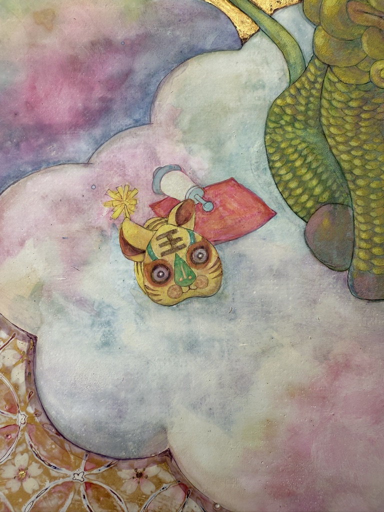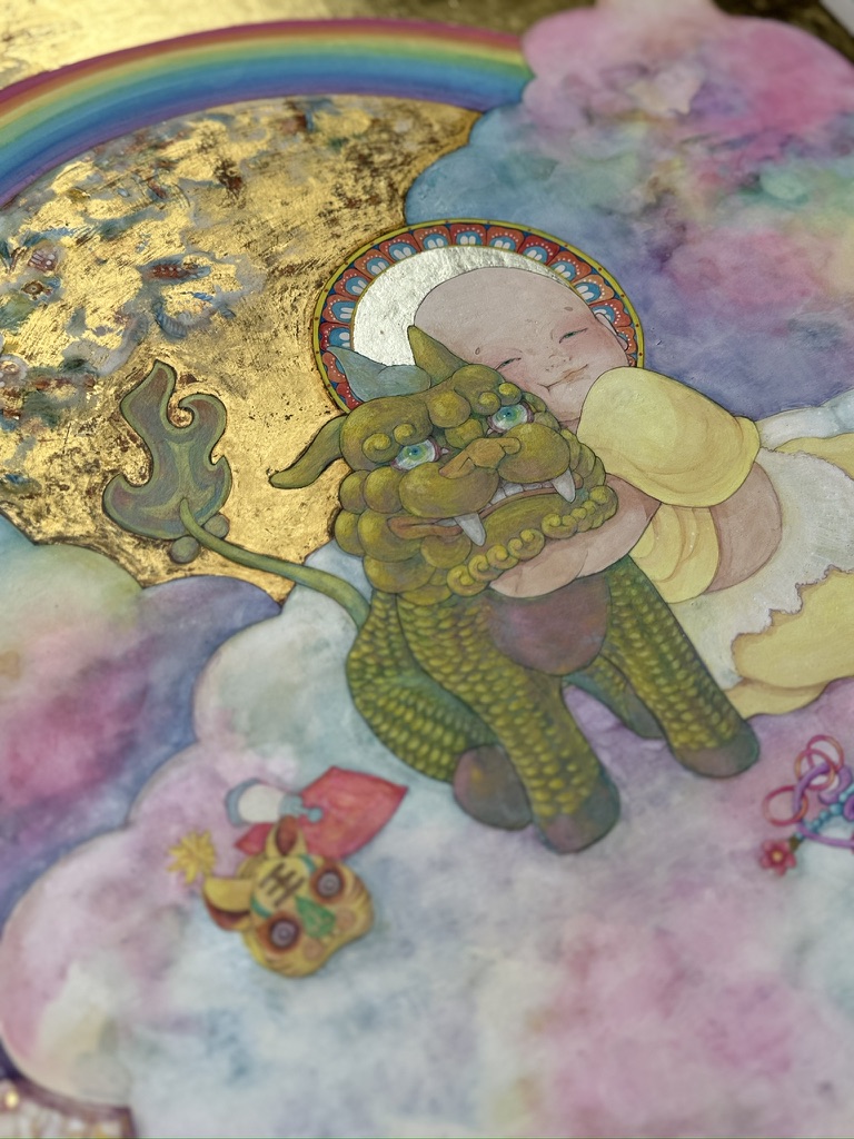 With a bright, carefree smile, he lovingly embraces a mythical Chinese creature called Taichō (Taichong)—a guardian beast said to have the head of a tiger, the body of a dragon, the tail of a lion, and the legs of a qilin.