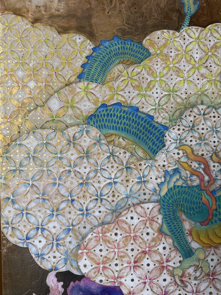 色とりどりの雲には七宝紋をあしらい、七宝紋の中心には珠をイメージした截金を施しました。