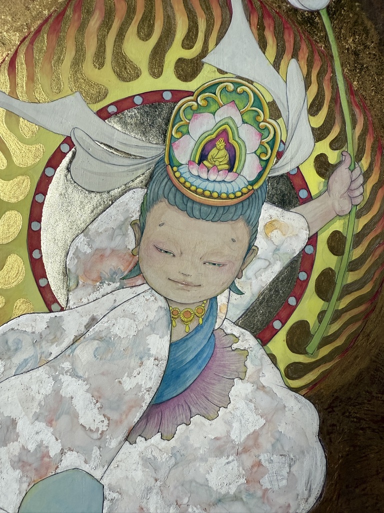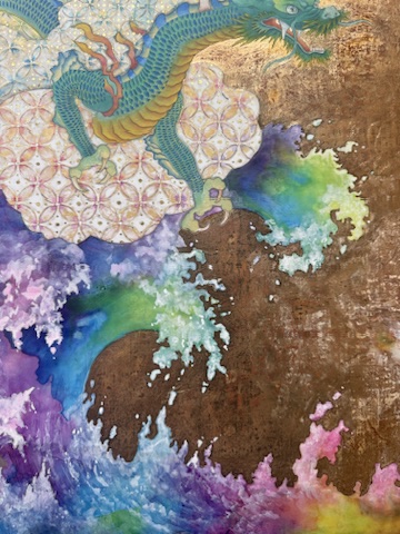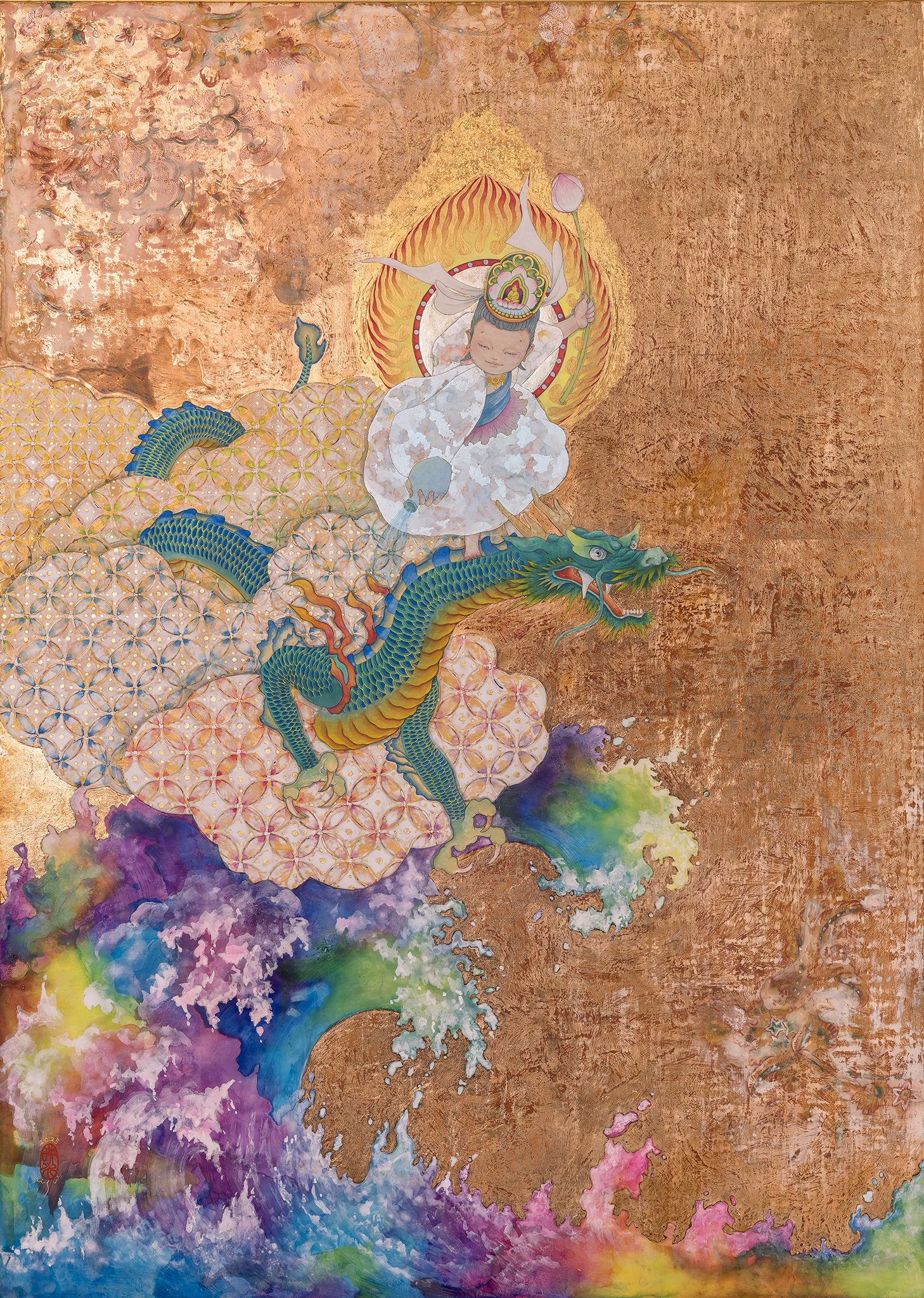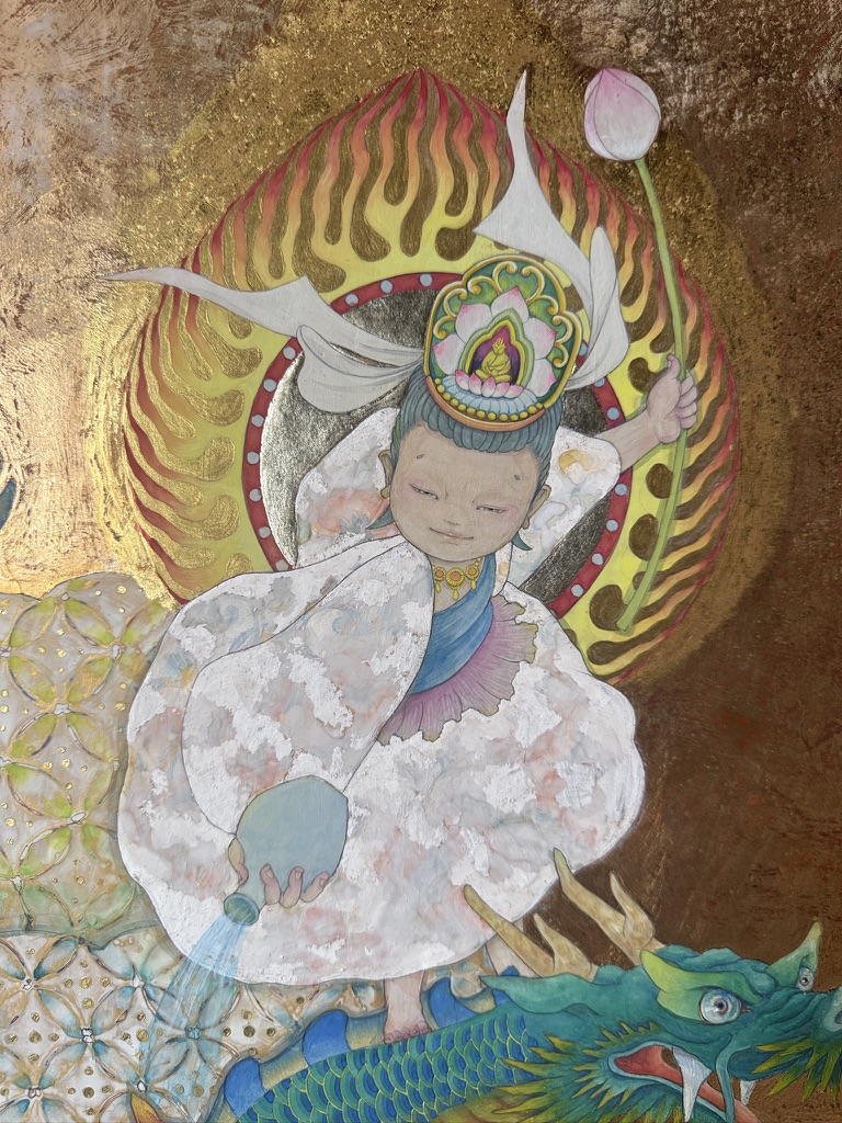 それからしばらくして、二人が少し成長した姿を描きたいと思い、龍ちゃんの背に乗ってまさに龍頭観音様のようなお姿で現れた様子を描きました。